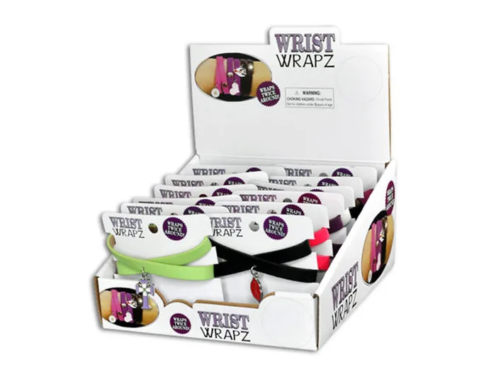 These Wrapz Charm Bracelets are the perfect party favor, best friend bracelet, Christmas stocking filler, front-desk display, and more! The bracelets come in assorted colors such as green, black, purple, and pink. Not only do they come in adorable colors, but they feature hanging charms such as red lips, or a purple cross. The soft matte material is very comfortable, and the bracelets hug your wrist effortlessly as they are double-wrap-around bracelets. The beautiful bracelets come packaged wrapped around a hanging card, and the different colors come inside of an open-air countertop display. The bracelets adjust to fit most and are relatively flexible.