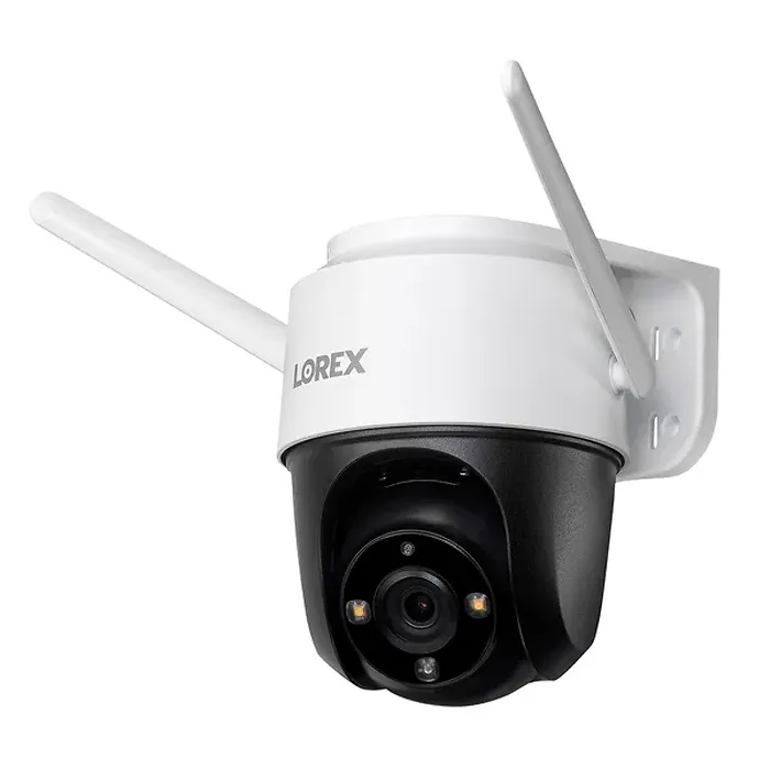Lorex F461AQD-E 2K QHD Outdoor Pan-Tilt Wi-Fi Security Camera. Provides 24/7 monitoring of wide, outdoor areas with 360deg panning, 180deg tilt, and 5x digital zoom; night vision up to 32 ft.; Color Night Vision with ambient lighting. Weatherproof (IP66) to operate all 4 seasons; operational temperature range: -22deg F to 140deg F. Person-detection notifications sent to Lorex Home app; motion-activated warning lights and manually triggered siren to deter unwanted visitors; 2-way talk using built-in microphone and speaker. Works with home's 2.4 GHz Wi-Fi system and app; compatible with Alexa and Google Assistant. Private and secure local storage of video recordings to microSD Card slot (supports up to 256 GB, Class 10 or higher); no subscription required. Can be paired with Fusion recorder (sold separately) to access 24/7 continuous recording to build customized security system that combines wired and Wi-Fi Lorex cameras. Includes mounting bracket, mounting template, mounting hardware, 32 GB microSD Card, power adapter and cable, Ethernet cap cover, and quick-start guides.