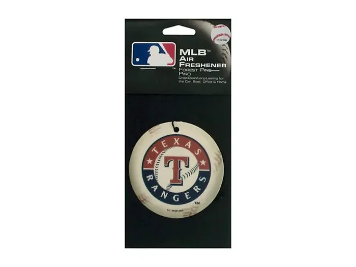 Enhance your car's atmosphere with the Texas Rangers Pine Scented Air Freshener. Show off your team spirit while keeping your vehicle smelling fresh and clean. This air freshener displays the iconic Texas Rangers logo and is conveniently packaged in an official MLB poly bag with a header card.