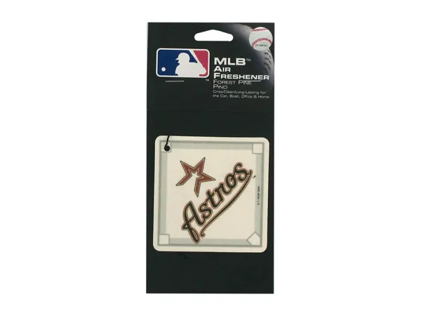 Enhance your driving experience with the Houston Astros Pine Scented Car Air Freshener. This air freshener not only keeps your vehicle smelling fresh and clean but also shows off your pride for the Houston Astros. It features the iconic Astros logo and emits a refreshing pine scent. Perfectly packaged in an official MLB poly bag with a header card, this air freshener is a great addition for any fan!