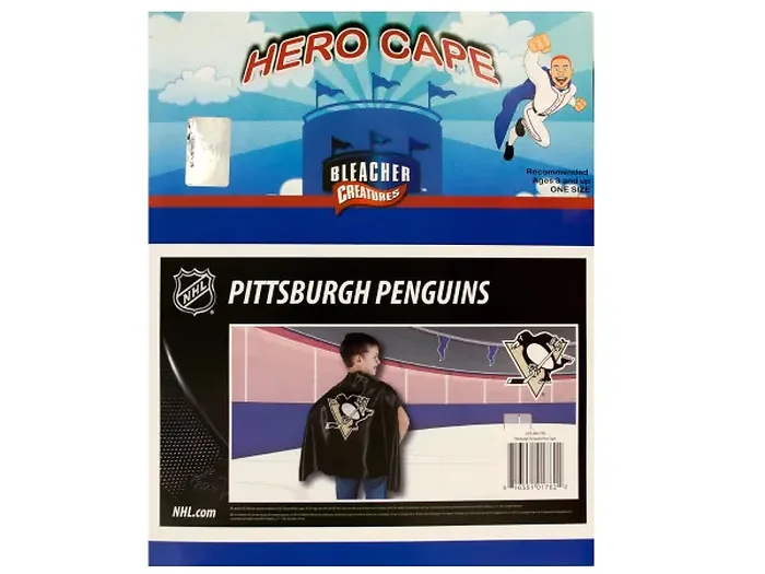 Transform into a hero for your favorite NHL team with the Pittsburgh Penguins Kids Superhero Cape. Made from high-quality polyester, this durable cape showcases the iconic Penguins logo on a striking black background. It features a convenient hook and loop neck closure for easy wear. Perfect for ages 3 and up, this cape is designed to fit comfortably, measuring approximately 38" wide and 24" long. It comes neatly packaged in a hanging poly bag, making it a fantastic gift for young fans.