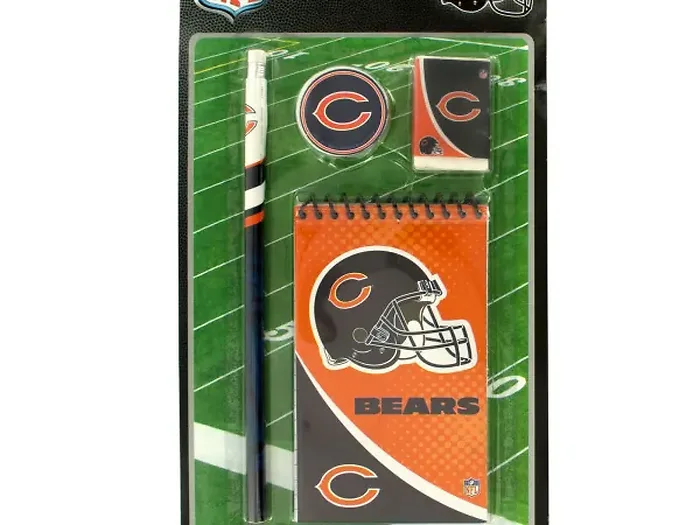The kit features vibrant Bears graphics, making it a perfect gift for young fans and students. It includes a spiral bound notepad, a pencil sharpener, an eraser, and a wooden pencil.