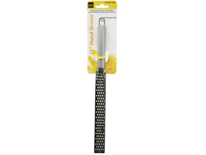 Constructed from durable stainless steel, this grater combines functionality with longevity. It comes neatly packaged on a hanging tie card for easy display and storage. The grater measures approximately 12.5 inches long, making it the perfect size for all your grating needs.
