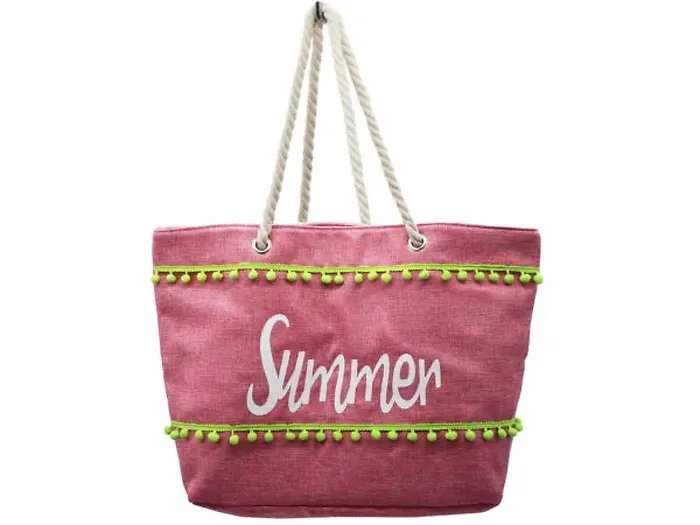 Available in two eye-catching designs: a salmon pink/red bag with lime green pom trim, adorned with the word 'Summer', and a light blue bag with black trim and neon tassels. Ideal for any summer adventure!