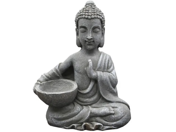 Add a touch of luck to your garden or living space with this Cement Sitting Buddha with Bowl Decorative Statue. Measuring 7.5" tall, this solid garden decor is made of cement and features a sitting Buddha holding a bowl. The bowl can be filled with moss, pebbles, small luck charms, and more! The statues are intricately carved with facial features, textured headpieces, and a flat bottom to sit perfectly straight. Ideal for indoor or outdoor use. Measures 7.5" tall. This garden decor must-have comes packaged loose with a UPC sticker on the bottom.