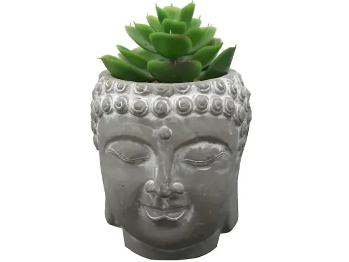 Enhance your indoor or outdoor space with this charming Buddha Head Planter. Crafted from durable cement, this planter features intricately carved details and is filled with beautiful faux succulents and decorative rocks. Measuring 4.75 inches tall, it provides a serene aesthetic that promotes tranquility and natural beauty in any environment.
