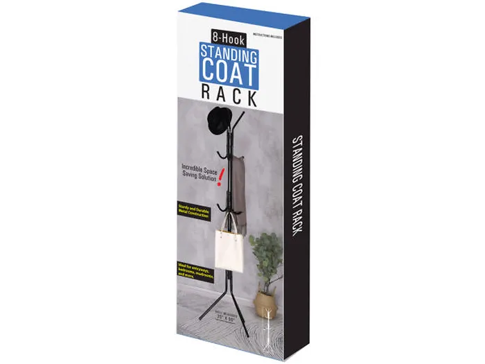 Enhance your entryway's functionality and aesthetic appeal with this 8-Hook Standing Coat Rack Organizer. This versatile and space-saving accessory is designed to provide you with a convenient storage solution for coats, hats, scarves, and more! Made of steel, this household organizing essential can hold everything you need including coats, jackets, scarves, and hats. The sleek metal frame is ideal for modern and traditional styles. The hooks are strategically placed to optimize your storage! This incredible space-saving solution measures 20" x 36" when fully assembled. Comes in black only. This organizing must-have comes packaged inside a color box with carrying handle.