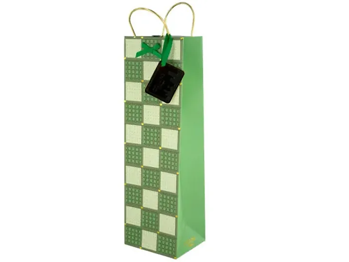 Celebrate in style with the Elegant Green Checkered Wine Bottle Gift Bag. This exquisite bag features a chic green checkered design accented with shimmering gold hearts. Designed for gifting wine or spirits, it includes a beautiful green bow and durable gold metal handles for easy carrying.