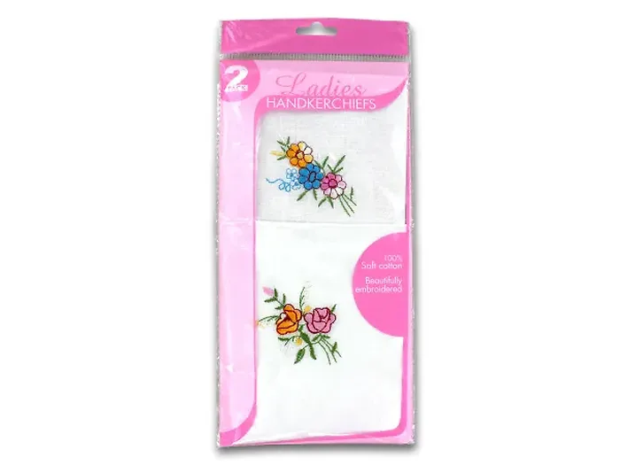 Great accessories, this 2-piece Ladies Handkerchief Set features soft cloths made from 100% cotton with a pretty floral pattern embroidered in one corner. Measures approximately 10 1/2" x 10 7/8". Comes packaged in a hanging poly bag.