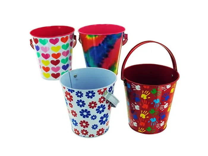 These assorted metal gardening buckets are perfect for holding small tools, seeds, or even serving as unique gift planters. Available in four vibrant styles—hearts, tie dye, floral, and hand prints—these buckets add a touch of charm to your gardening experience.