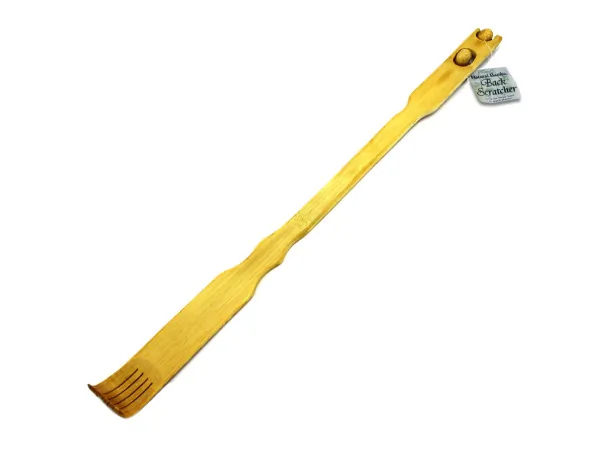 Great for scratching and massaging hard to reach places, this handy 2 Roller Back Scratcher features a scratcher end with 5 "fingers" and an opposite end handle with 2 textured massage rollers. Made of bamboo with a clear protective finish. Measures approximately 18.5" long. Comes loose with a UPC sticker.