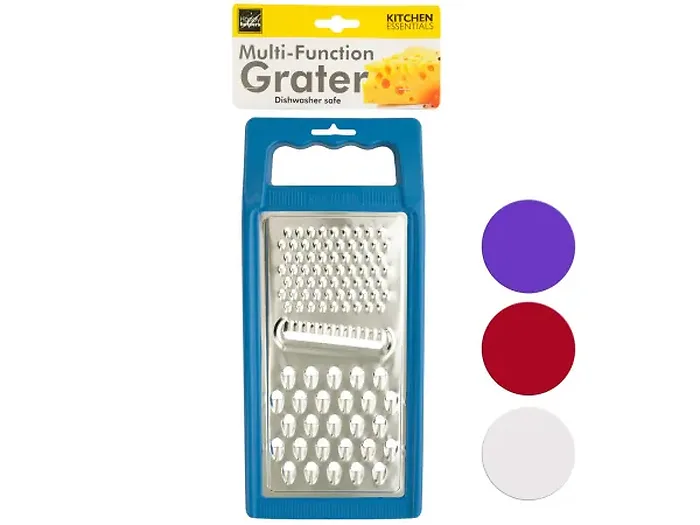 The durable plastic frame includes an angled handle for comfortable use and a hanging hole for easy storage when not in use. Measuring approximately 9.5" x 4.5", this grater is dishwasher safe for quick and easy cleanup. Available in assorted colors, it adds a splash of style to your kitchen.