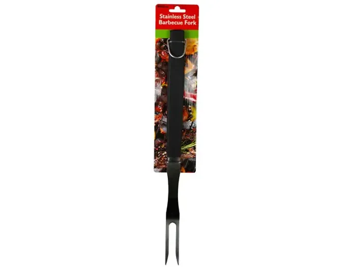 This barbecue fork features a convenient D-ring hook for easy hanging and storage, and its durable black plastic handle provides a secure grip, making it a must-have for your grilling toolkit. Packaged on a hanging panel, it is perfect for both home use and as a gift for the grilling aficionado.
