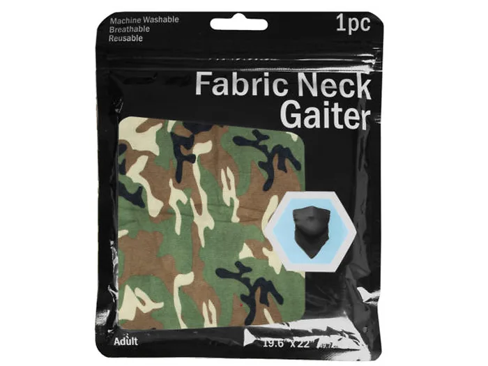 The Camouflage Printed Neck Gaiter is a multi-functional way to not only protect yourself but also adds a touch of style. Breathable and easy to wear, the neck gaiter can be worn as a face cover, bandana, beanie, headwrap, pirate cap, and scarf. The neck gaiter is perfect for running everyday errands but is also great for outdoor activities such as fishing, hiking, camping, motorcycling, yoga, and to wear while traveling. The gaiter is made out of 98% polyester and 2% spandex making it lightweight and easy to carry in your purse or pocket. Comes individually wrapped inside a sealed polybag. Comes in assorted camouflage colors including: blue, green, pink, and purple. One size most. Measures approximately 19.6" x 22".