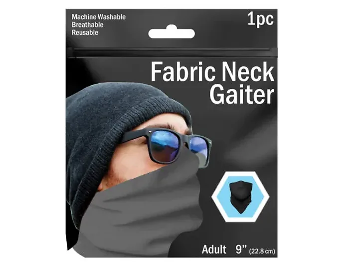 Made from a blend of 98% polyester and 2% spandex, it is lightweight and easy to pack in your purse or pocket. Each neck gaiter comes individually wrapped in a sealed polybag and is available in assorted colors: gray, black, purple, and light blue. One size fits most. The gaiter measures approximately 9".