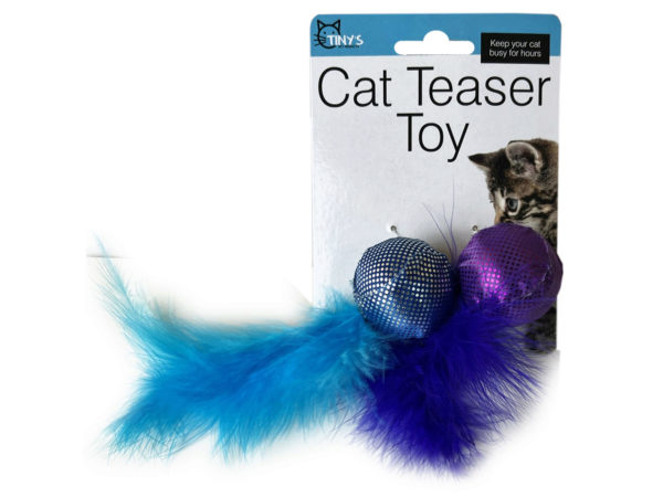 Keep your cat, kitten or furbaby entertained for hours on end with this Cat Teaser Toy with Center Jingle Ball and Feathers. This interactive pet toy provides much-needed exercise for indoor cats. You'll love watching your cat jump, stalk, and pounce on their new toy! This cat toy features an elastic cord with bells and feathers attached to a long plastic handle to you can safely play with your friend. Keeping your cat exercised with this active toy helps keep kitties from clawing furniture and carpet. This must-have toy comes packaged on a tie card with a hanging hole.