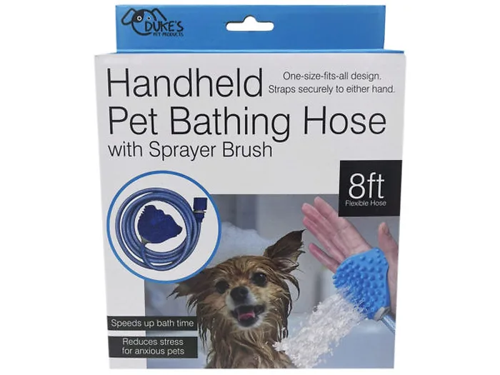 You'll feel like a professional groomer when using this Handheld Pet Bathing Hose with Sprayer Brush. This pet grooming tool turns your faucet or water hose into a gentle sprayer brush and will have your dog or puppy love taking a bath! Slip the brush side over your hand like a glove, turn on the water and gently wash your pet's coat. The shower head water flow helps reduce your animal's anxiety during bathing, while also letting you conveniently use one or both hands to hold them in place. This grooming essential includes an 8-foot flexible hose, handheld sprayer brush, and attachments for connecting to the shower and garden hose. The strap on the sprayer brush is adjustable for a secure fit. This convenient pet grooming kit comes packaged inside a color hanging box.