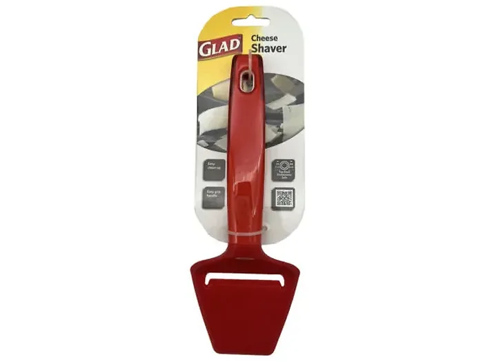 The Glad Red Cheese Shaver is designed to effortlessly slice thick blocks of cheese into perfect, uniform pieces. Ideal for preparing cheese for a variety of dishes including hamburgers, sandwiches, charcuterie boards, and casseroles. Its ergonomic handle provides a strong grip, ensuring comfort during use. The shaver is top-rack dishwasher safe for easy cleaning and is available in an attractive red color. Measuring 3.1"x1.2"x8.5", this kitchen essential is perfect for every cheese lover.