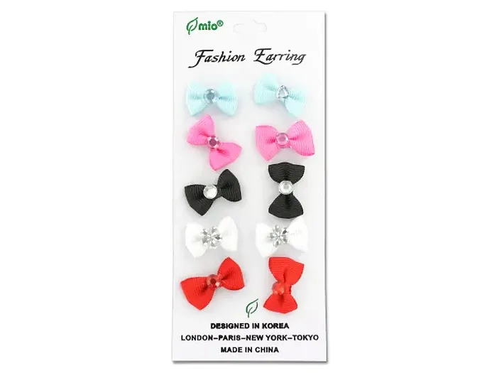 Enhance your accessory collection with these delightful bow earrings! Each card features five pairs of beautifully crafted earrings, each adorned with a shimmering rhinestone at the center of the bow.