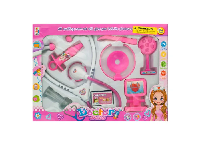Kids will be entertained for hours while learning about the medical field with this Kids' Doctor Play Set featuring colorful plastic pieces in small sizes for kids' hands. Set may include a stethoscope, heart monitor, syringe, vial, tweezers, medicine and more. For ages 3 and up. Comes packaged in an individual window box. Box measures approximately 13.75" x 1.625" x 10".