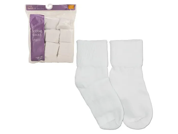 Each pack contains 9 pairs of stylish white bobbie socks, perfect for everyday wear. Packaged conveniently in a hanging poly bag, these socks are an essential addition to any girl's wardrobe. Fits girls shoe size 7 through 10.