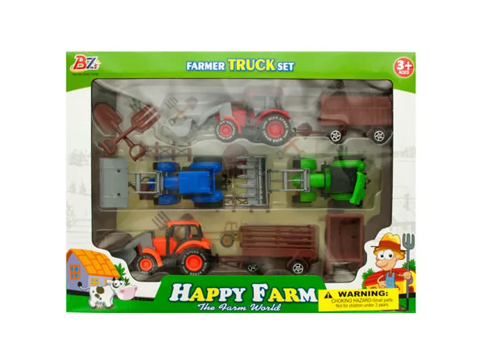 Have some fun on the farm with this Farm Tractor Truck & Trailer Set featuring a collection of tractors in assorted colors, trailers and tools. Set includes 4 tractors, 2 trailers, 1 wheelbarrow, 1 shovel and 1 digging fork. For ages 3 and up. Comes packaged in an individual box. Box measures approximately 15.25" x 2.625" x 11.5".