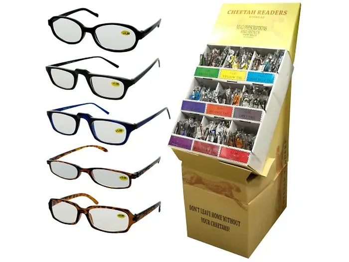 Stay stylish while reading with our Trendy Reading Glasses. These lightweight glasses make it easy to read anything from books and prescriptions to menus and bills. With a variety of styles, colors, and strengths available, you're sure to find the perfect pair for you. Each folded pair measures approximately 5.75" x 1" and comes neatly packaged in a poly bag. Our floor display features an impressive 360 pieces to ensure you have enough stock for your customers.