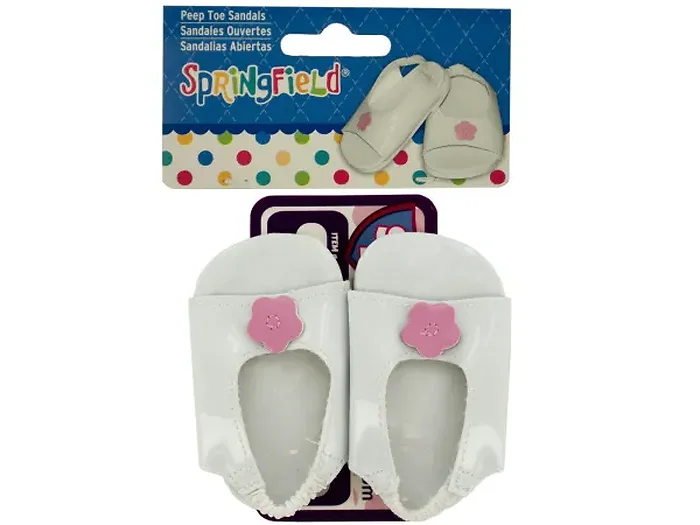The sandals feature open toes and elastic heel straps for a snug fit, ensuring your doll can play in style and comfort. Designed for children aged 4 and up, these sandals come packaged in a convenient poly bag with a colorful header card.