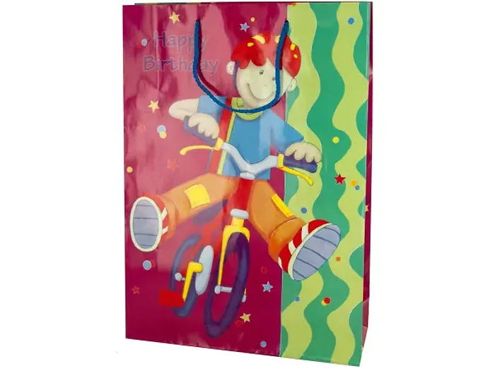 The Colorful Birthday Bike Gift Bag features an exciting design of a boy riding a bike accompanied by stars and playful wavy lines, along with the cheerful phrase 'Happy Birthday'. Perfect for presenting gifts at birthday parties, this bag adds a touch of joy to any celebration.