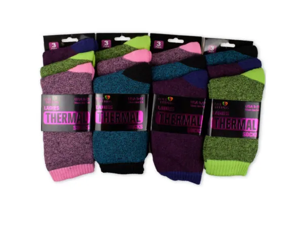 Keep your feet warm with these thermal socks. Perfect for ladies of shoe size 9-11. Each package includes one pair of think cushioning, high bulk yarn and maximum heat. These socks are 58% cotton, 41% polyester, and 1% rubber. Machine cold wash only and tumble dry low. Comes packaged in a hanging header card and assorted colors.