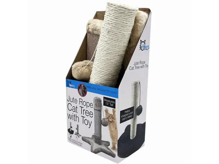 Enhance your cat's playtime and protect your furniture with our Stylish Jute Rope Cat Tree featuring a Fun Hanging Toy. Designed with durable jute material, this cat tree keeps your furry friend's claws away from your valuable upholstery while providing endless entertainment.