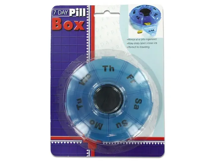 This blue round pill box helps you keep your medications organized and is perfect for on-the-go lifestyles.