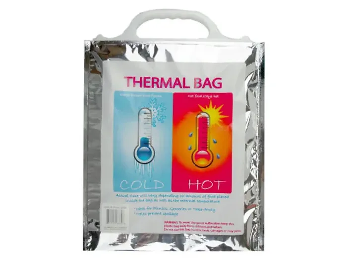 Ideal for picnics, groceries or take-away, this Thermal Bag with Handle keeps frozen food frozen and hot food hot. Also helps prevent spillage. Actual warming/cooling time will vary depending on the amount of the food placed inside the bag as well as the external temperature. Bag is made of metallic plastic with a durable plastic handle for easy transport. Measures approximately 13 1/2" x 11 3/4". Comes loose.