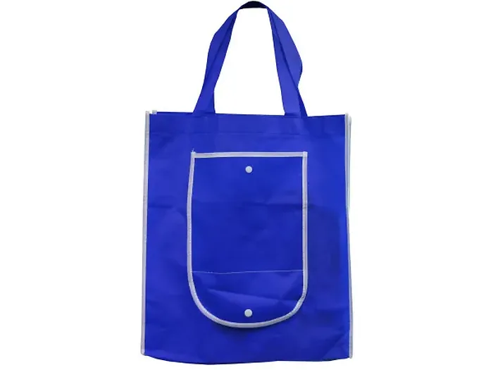 The tote folds neatly for compact storage when not in use. With its vibrant solid blue color paired with stylish white piping, it combines functionality with aesthetics.
