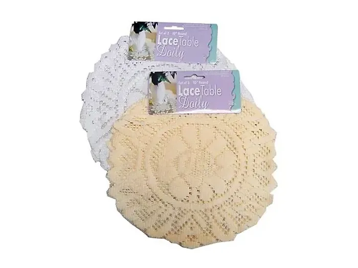 Ideal for protecting and beautifying tabletops, this 3-piece Round Lace Table Doily Set is useful in a number of settings, washable and features a pretty scalloped edge. 100% polyester. Measures approximately 10" in diameter. Comes packaged with a hanging panel.