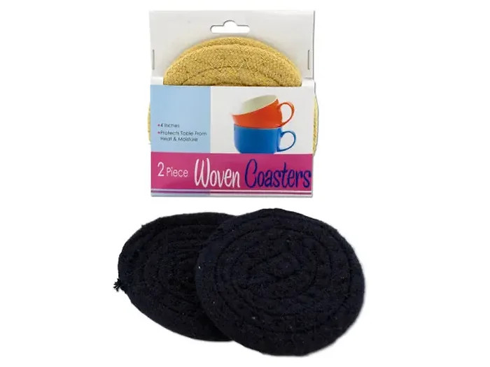 Protect your tables and countertops with our stylish woven coasters. Crafted to withstand heat and moisture, each set comes with two coasters available in chic navy blue or light yellow. Perfect for everyday use, these coasters are packaged beautifully on a wrap-around hanging card, making them a great gift option as well.