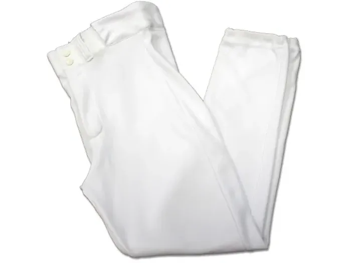 These white baseball pants are designed for comfort and functionality. Featuring tunnel style belt loops and a 2-inch elastic waist with a double snap metal button front, they ensure a secure and adjustable fit. The finished cuffs add a polished touch, while the convenient back pocket is perfect for storing small essentials during games or practices.