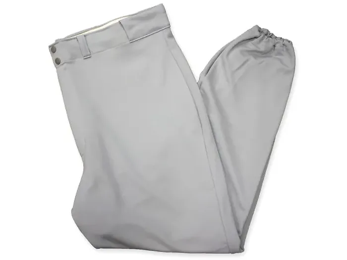 These medium grey baseball pants are designed for comfort and functionality. Featuring tunnel style belt loops and a 2" elastic waist with a double snap metal front, they provide a secure fit. The finished cuffs add a polished look, while the convenient back pocket offers easy storage for small items.