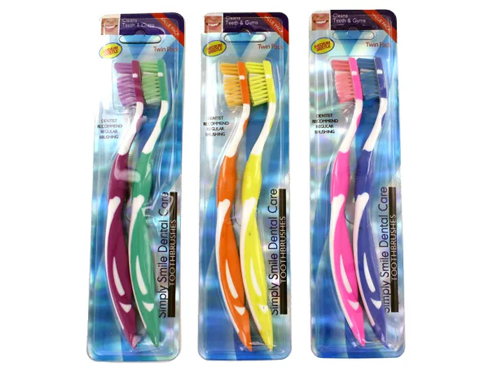 Help improve oral hygiene, keep plaque from building up and aid in providing fresh breath with this 2-piece Toothbrushes Set featuring medium bristles with a pointed head and angled sides to get between gums and teeth. Comes in assorted colors. Each brush measures approximately 7 1/2" long. Toothbrushes come packaged in a holographic blister pack.