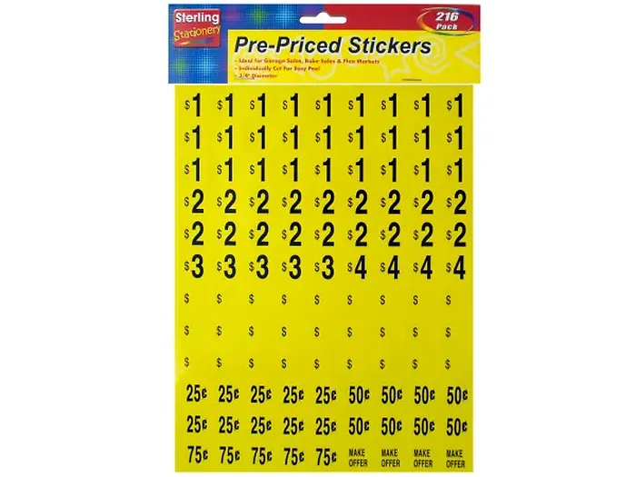 These circle pre-priced stickers are perfect for garage sales, bake sales, and flea markets. Each sticker is individually cut for easy peeling, making pricing items quick and efficient. The stickers measure 3/4" in diameter and feature various denominations including $1, $2, $3, $0.25, $0.75, 'make offer', and a blank sticker with a dollar sign. With a total of 216 stickers per pack, they come neatly packaged in a poly bag with a header card to keep everything organized.