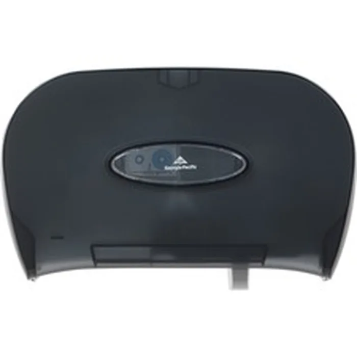 Double-roll, covered bath tissue dispenser is designed to reduce maintenance time, minimize outages and reduce waste. It is ideal for high-traffic areas. Dispenser holds either two rolls of 1,000 sheet two-ply, or two rolls 1,800 sheets one-ply Georgia Pacific Micro-Twin Tissue. Both kinds of rolls can be up to 4" wide. Sliding gate mechanism helps ensure full utilization of the stub roll, eliminating stub-roll waste. Dispenser can be mounted vertically or horizontally.