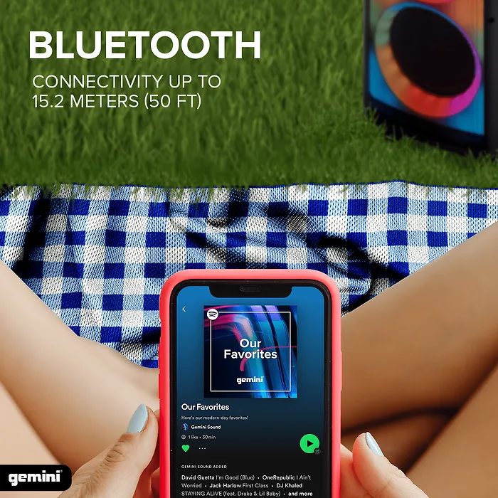• 1,000-watt peak power (PMPO) Class D amplifier 120 watts RMS;• Hi-Fi Class Bluetooth(R) v5.0 streaming with up to 30-ft. range; TWS compatibility to pair a like speaker (sold separately) for stereo playback;• Frequency response: 25 Hz to 20 kHz;• Built-in LED grille party lighting with 4 user-selectable modes of amazing multicolor lighting effects that dance with the music;• Disco lighting on top, sides, and rear of unit create beautiful 360deg party lighting effects;• 8-in. subwoofer, 8-in. midrange woofer, one 1-in. high-frequency tweeter on front, and two 1-in. tweeters for the sides allow for clear audio across the entire frequency range with 360deg dispersion; rear port disperses ultra-smooth low-end bass and clear high-end treble in all directions;• X Drive Bass Boost takes the listening experience to earthshaking proportions;• Media player for USB playback; FM radio;• 1/4-in. microphone input, 1/4-in. guitar line input, and 3.5-mm aux input;• Handles and wheels for portability;• Rechargeable battery provides up to 4 hours of playback time;• Includes remote, FM antenna, power adapter, and microphone with cable;
