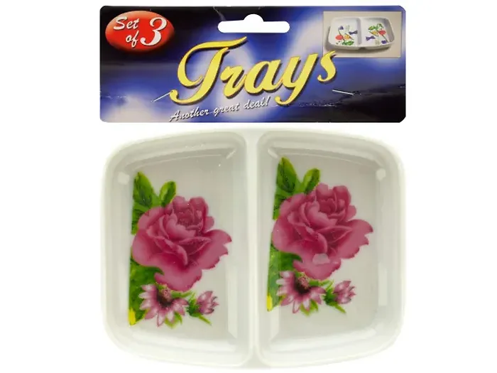 Perfect for serving condiments, candies, small snacks and more, this 3-piece Double-Sided Rose Print Sauce Trays Set features small square dishes with rounded edges and recessed sections. Each dish measures approximately 4" x 3.25" x 0.5". Comes packaged in a poly bag with a header card.