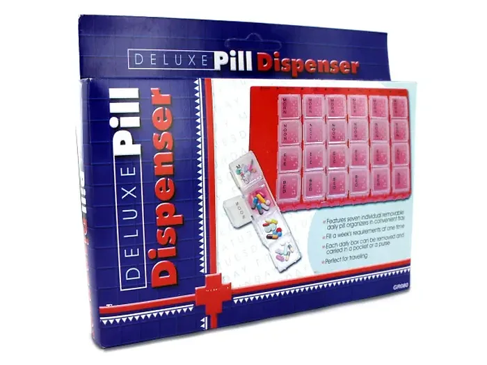 With a total of 28 compartments, this pill dispenser is perfect for travel and daily use. Dimensions of the main organizer are approximately 4.5" x 6.75" x 0.75". It comes neatly packaged in a hanging box, which measures about 7.25" x 1" x 6".