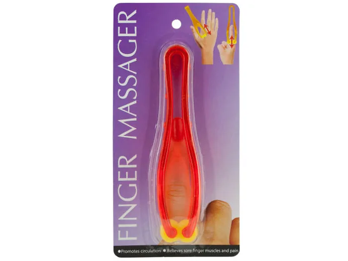 Easily give yourself a hand massage with this Finger Massager featuring a durable plastic massage tool with soft plastic rollers that are designed to promote circulation and relieve sore finger muscles and pain. Massager gently works to improve finger flexibility and grip strength. Massager measures approximately 5.75" long. Comes packaged in a blister pack.Available in a pack of 20Product Type: Bulk Buys