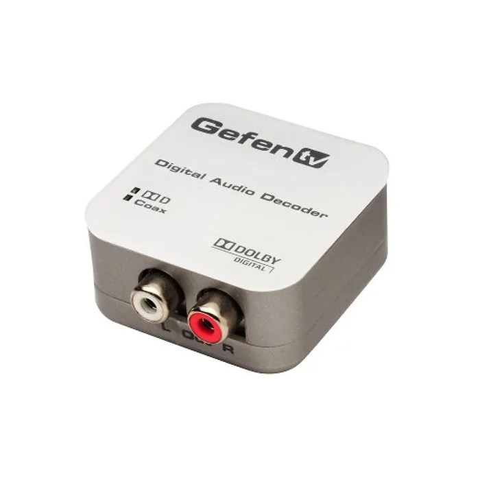 GefenTV Digital Analog Decoder converts audio encoded in Dolby Digital down to 2-channel L/R. Convert up to 5.1-channel audio encoded in Dolby Digital Surround to L/R analog audio -- without additional costly equipment! The GefenTV Digital Audio Decoder takes audio encoded in Dolby Digital (at up to 5.1 channels) from your multichannel S/PDIF or TOSLINK digital audio source and converts it to L/R analog audio -- without the need for any other external equipment! With the GefenTV Digital to Analog Decoder you can listen to digital audio sources such as DVD and CD players or digital computer audio on your legacy analog sound system, preserving your current investment. A coaxial or optical audio output on your digital audio source connects into the input on the Digital to Analog Decoder. The input type is chosen with the Decoder's selector button. The Decoder is connected to power. Analog RCA connectors on the Decoder output L/R analog audio to powered speakers.