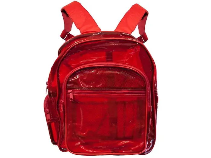 This Red Transparent Plastic Backpack is perfect for school, travel, camping, and hiking. It boasts a sturdy construction made of durable plastic, designed for reliability. The backpack includes multiple storage pockets, making organization a breeze. Features include a convenient outer zipper pouch with pen holders and an additional outer zip pocket, as well as a mesh pocket with an adjustable toggle cord.