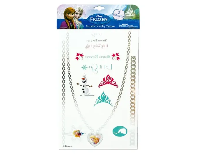Let your little ones express their creativity with the Disney Frozen Metallic Tattoo Jewelry Set. Adorned with beloved Frozen characters and enchanting quotes, these temporary tattoos are perfect for adding a touch of magic to any outfit. Whether for a birthday party or a playdate, these tattoos make delightful party favors. Suitable for girls aged 3 and up, each set comes with easy-to-follow instructions and is beautifully packaged in a poly bag with a header card.
