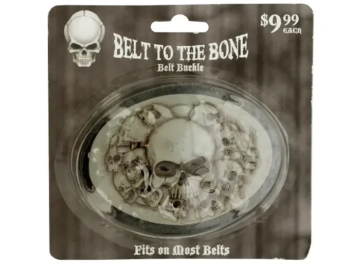 Enhance your outfit with the edgy Skull Design Belt Buckle. This unique accessory showcases a striking large skull at the center, surrounded by a ring of smaller skulls and bones. The design is complemented by a sleek black decorative border, making it a perfect addition to any wardrobe.