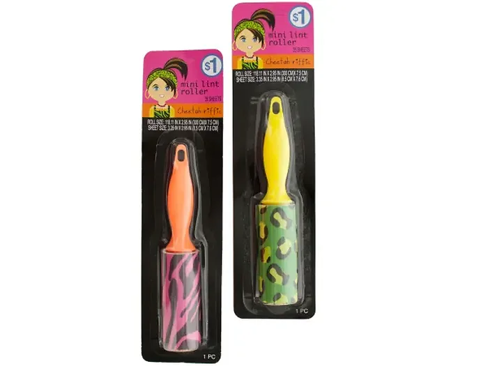 Each roller is covered with a decorative animal print paper cover, adding a touch of personality to your lint removal routine. With a roll size of 118.11" x 2.95" and a sheet size of 3.35" x 2.95", it’s perfectly sized for convenience. The roller measures approximately 6.5" long and comes in assorted styles including a green cheetah print with a yellow handle and a pink zebra print with an orange handle.